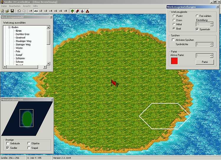 |   | Zum Zeichnen der groben Landmasse nimmst du aus der Werkzeugauswahl --> Boden --> Gras (auf "Dunklem Gras" und "Grasinsel" kann man im Edi keine Gebäude setzen) und stellst in den