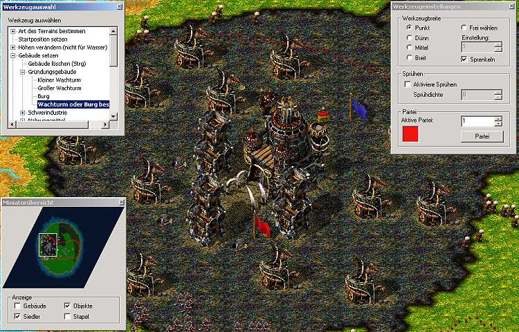 |   | Jetzt ist es an der Zeit, die ersten Gebäude zu setzen. In den Werkzeugeinstellungen muss dazu die jeweilige Partei